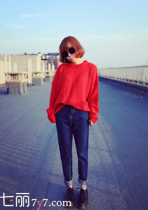 宽松款大红色毛衣+靛蓝boyfriend卷边牛仔裤