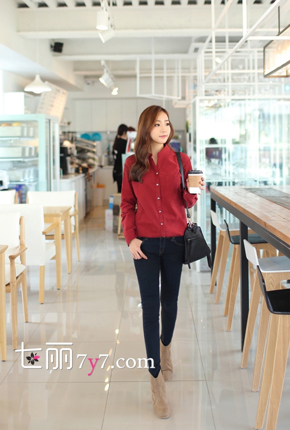 暗红色衬衣+深色紧身牛仔裤+驼色踝靴