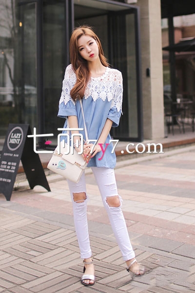 搭配看点:浅蓝色的上衣,肩部采用蕾丝拼接设计,增加了不少精致柔美感,五分袖设计刚刚好适合5月来穿,下身穿破洞牛仔裤,兼顾淑女风情,更多了一些时髦帅气感。