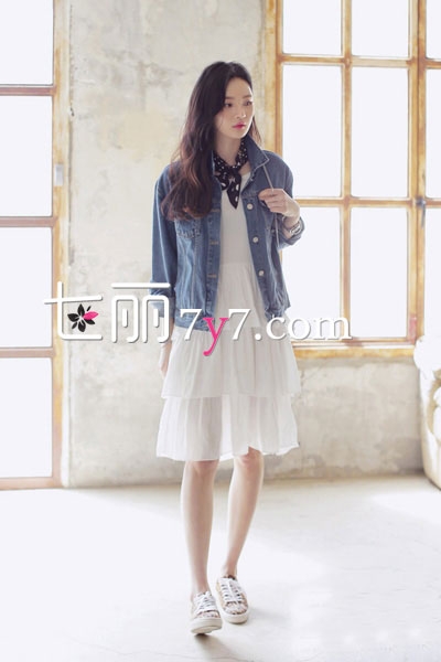 搭配看点:一件简单的白色连衣裙,单穿显得清纯干净,如果是外搭上有些怀旧风的牛仔外套,让整个造型增色不少,也是现在的季节里不能少的服饰,所以快试试吧!