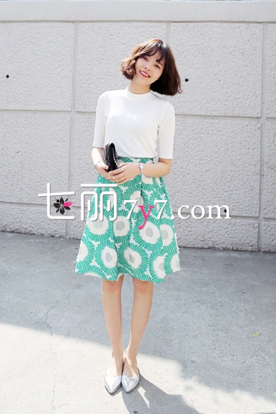 搭配看点:绿色大圆点的半身裙,清新的色彩加上圆点元素,显得不那么单调,更有如沐春风的感觉,上身穿中袖白色T恤,整体装扮给人清爽气息,同时又有几分优雅和柔美。