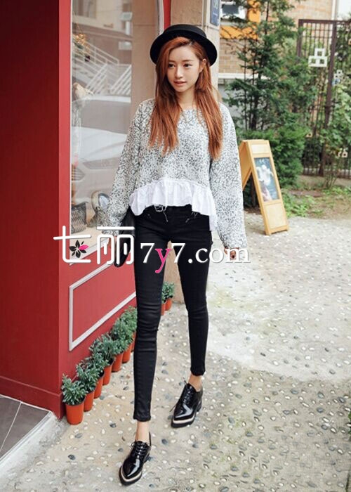搭配看点:黑色的高腰裤,很百搭的一款服饰,同时又能帮助显瘦,上身穿短款拼接上衣,层次感的穿法提高腰身,荷叶边设计还有几分甜美感,脚踩一双尖头小皮鞋,塑造复古小清新味道。