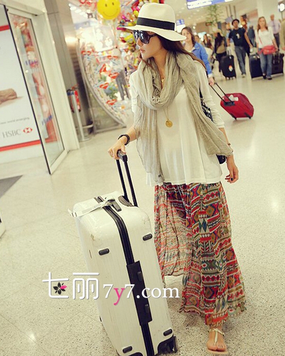 搭配看点:随机排列的色彩斑斓的印花色彩度相近,让雪纺裙裙身的图案造型繁复但不杂乱,搭配一件垂坠质感的白色棉T与随性自然的浅灰色丝巾,瞬间充满了浓浓的海滨度假风,你准备好这次的旅行了吗?
