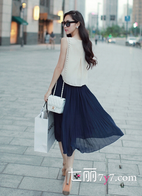 搭配看点:超仙的白色半透雪纺背心,半透的雪纺材质若隐若现地透露着小性感。搭配一款藏蓝色雪纺半身长裙,蓝白的拼色给人视觉带来强烈的冲击之余,却令人眼前一亮,过目不忘。