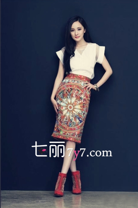 搭配看点:杨幂这款印花包臀裙极具欧洲艺术气息,搭配一款白色衬衣能很好的凸显包臀裙的华丽感,拼接和透视的设计让白衬衫更加性感和抢眼,不至于被包臀裙抢尽风头。脚上的踝靴大牌范儿十足,当然,搭配一款浅口黑色细高跟鞋也一样起范儿。