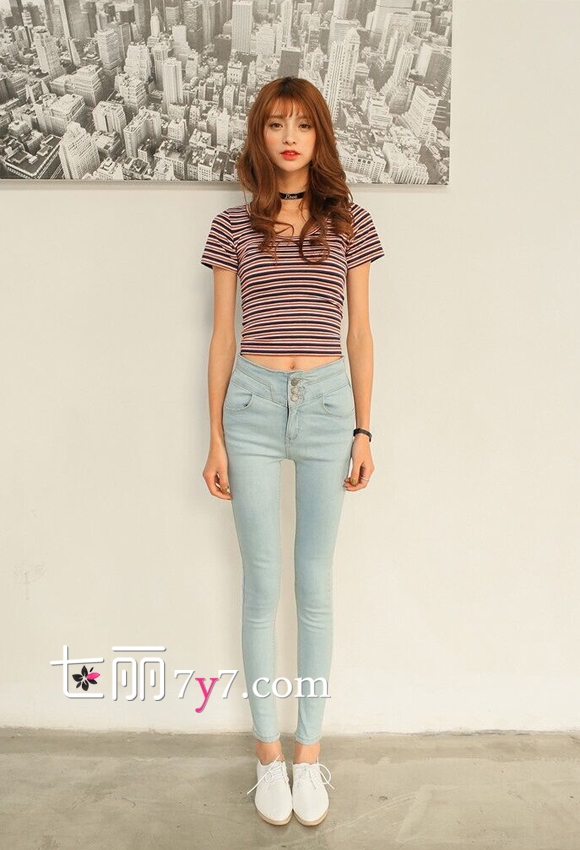 紧身露脐短袖横条纹T恤+水色牛仔裤