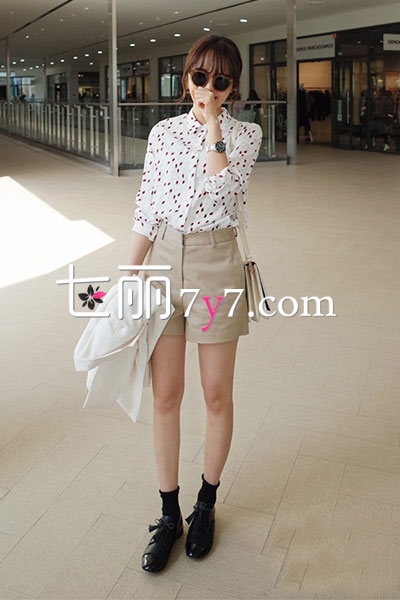 搭配看点:浅卡其色的高腰短裤,很简约的一款,正因为这种简洁,上身选择了波点白衬衫,扎起来的穿法,拉长下半身线条比例,很清新怡人的装扮,穿上小皮鞋,五一出游穿让人心动不已。