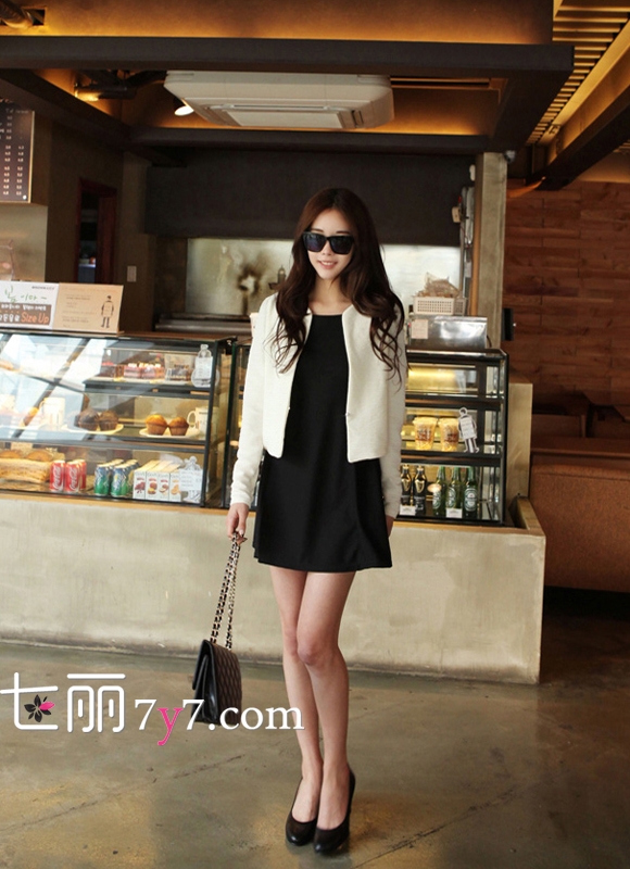 搭配看点:黑白搭配总是不会出错的,白色的短款外套,搭配一条黑色的宽松款连衣裙,外加一双彰显简约女人魅力的黑色高跟鞋与黑色链条包,最简单的搭配也是最不会退流行的。这样的一身气质简约穿搭非常适合OL们的通勤装哦。