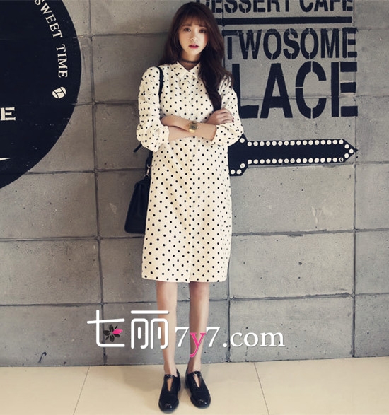 搭配看点:波点衬衣连衣裙非常的甜美可人,十分适合初夏穿着,搭配一款黑色皮质单鞋与斜挎包,精致干练又很有潮范儿。当然,也大可以再搭配一款细腰带,轻松勾勒腰部曲线,更加迷人哦。