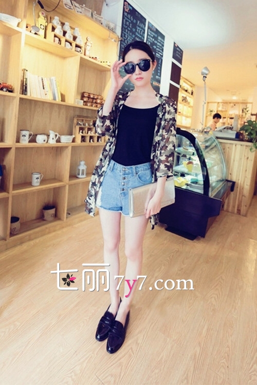 搭配看点:迷彩印花防晒衣十分的帅气,同时也很有中性气息,搭配黑色吊带性感又显瘦,下搭牛仔短裤更酷感和时尚感。非常率性和吸睛的搭配哦,一双皮质单鞋舒适又个性,再搭配一款金色手拿包,分分钟秒杀路人。