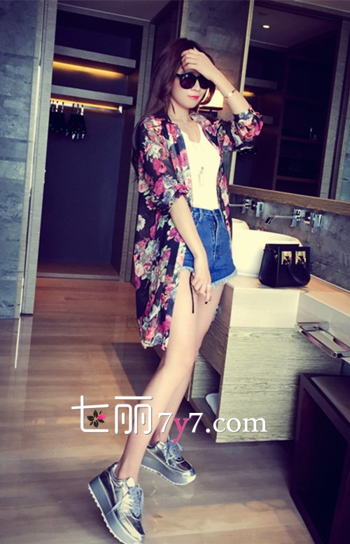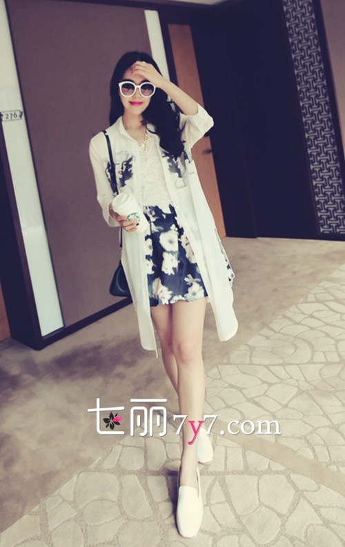 搭配看点:碎花图案防晒衣非常的甜美,搭配白色单品更显气质。鞋子可以选择舒适的平底鞋或绑带凉鞋,下装选择一条清爽性感的热裤,出街十分抢镜迷人呢。