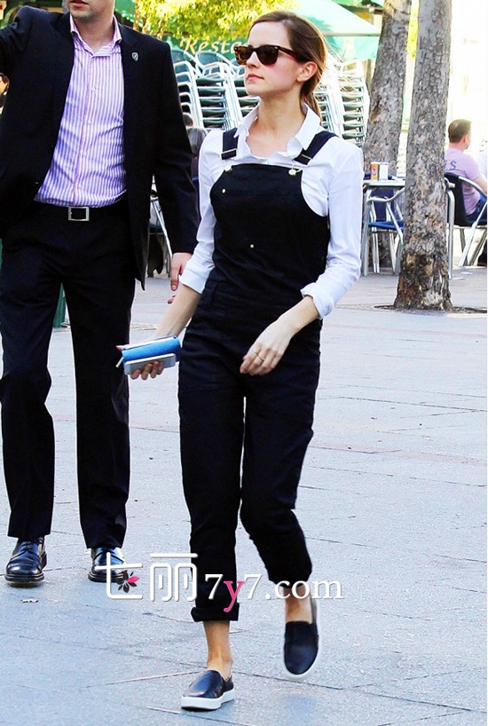 搭配看点:艾玛斯通这一身背带裤搭配白衬衫十分具有少女气息,配饰上选择墨镜和黑色乐福鞋与背带裤色彩呼应,提升时尚感的同时让整个造型更加统一和谐。白衬衫领口扣子解开更加起范儿哦,裤脚随意卷起更添酷感,再搭配一款个性手拿包分分钟美爆街头。
