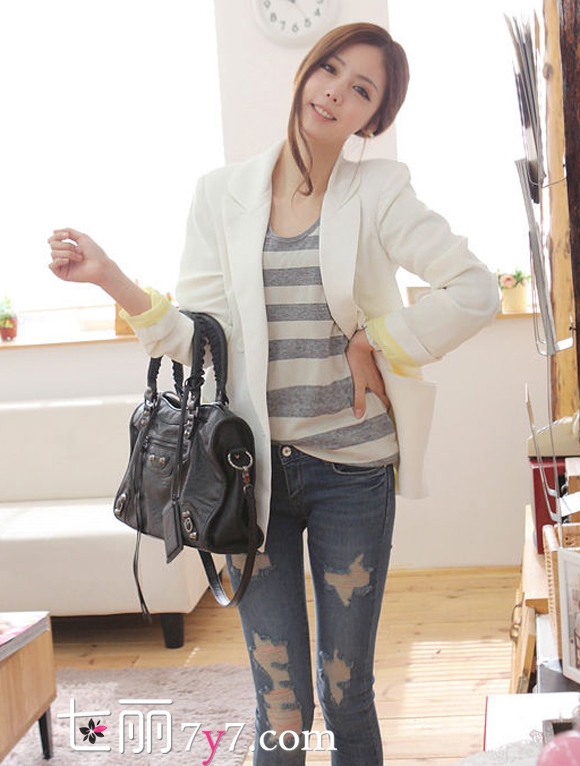 搭配看点:灰白条纹T恤搭配干练利落的白色小西装外套,看上去简约大方,十分适合OL的通勤装扮。下半身混搭一条破洞牛仔裤,不仅出彩,也可以能够起到抓人眼球的效果,将原本职业的上半身混搭成了休闲街头的风格,手上的黑色经典Balenciaga机车包也呼应了整体混搭出来的休闲随性之感,有时,配色不用太丰富,不同风格间单品的混搭也会有意想不到的好效果。