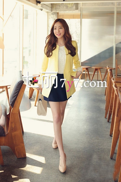 搭配看点:亮黄色的小西装外套,抢眼又明媚的色彩,春夏都很适合穿,整体设计非常大方简约,内穿白色上衣,配上黑色短裙,很知性干练的装扮,修身设计帮助修饰身材,尽显淑女气质。