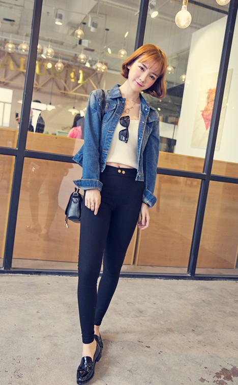 搭配一:牛仔外套+白色吊带背心+小脚裤+平底鞋