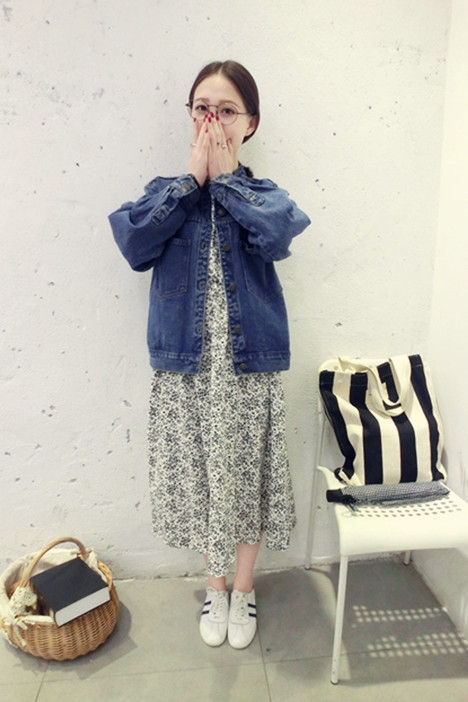搭配看点:牛仔外套搭配长裙很有文艺女神范儿,随意搭配一双白球鞋清新又休闲,一款条纹布袋包极具学院气息,非常减龄显嫩的搭配哦。