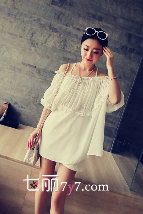 搭配看点:中袖露肩连衣裙十分的优雅婉约,尤其是雪纺材质,飘逸又唯美,搭配一款同色链条包,更显高贵和大牌,而衣服都市气息十足的墨镜,绝对能让造型时尚指数直线飙升。