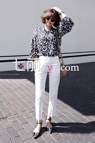搭配看点:繁琐的白色印花衬衫,看上去很多复杂其实很简单,纯色的搭配看去就觉得舒适,下身穿白色西裤,立体的垂坠剪裁,凸显干练利落,扎起来的穿法,脚踩尖头平底鞋,帅气又不失优雅味道。