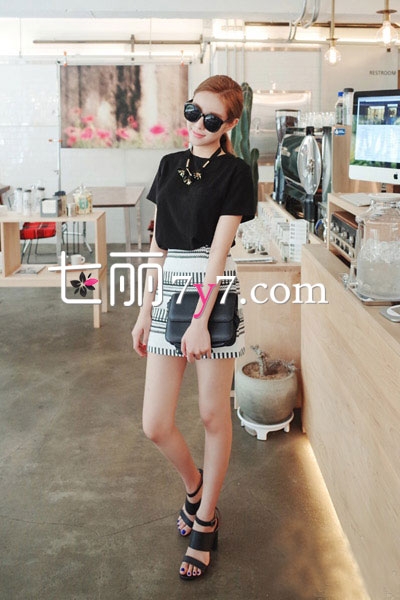 搭配看点:夏季衣橱中几乎不能少的黑色T恤,帅气简单又百搭,如果是穿黑白色印花图案的包臀短裙,恰如其分的包裹住完美曲线,整体看上去非常的清爽大方,同时又时髦性感。
