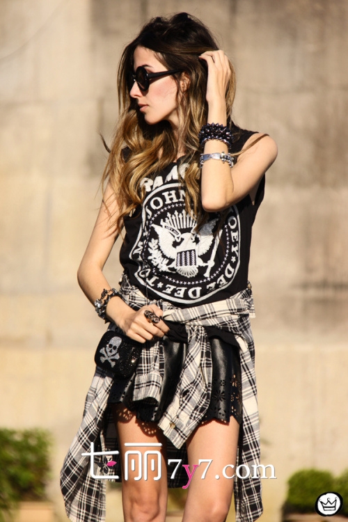 搭配看点:中性风十足的黑白格子衬衫简约又帅气,搭配黑色字母T恤,经典的黑白配色与格子衬衣相呼应,摩登又不乏街头时尚酷感。下装选择的是皮质雕花短裙,个性的雕花设计性感又甜美,让硬朗的皮革材质也柔美起来。手腕的夸张铆钉配饰和骷髅头链条包很有哥特风格,整个造型很有摇滚女孩范儿哦。