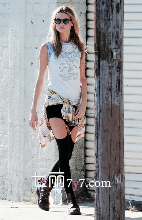 搭配看点:黑白格子衬衣加入黄色带来一丝暖意,与浅蓝色图案T恤搭配却又显得十分清凉,很有夏日气息。下装选择别致的裤袜与马丁靴,性感又极具酷感,也可以将裤袜换成破洞牛仔热裤,一样的时髦不减,气场满分哦。