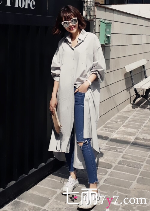 搭配看点:破洞牛仔裤搭配长款衬衣很有高街范儿,腔调十足哦。也可以选择在衬衣内搭配一款白色或黑色吊带背心,将衬衣扣子解开,更显帅气和性感,搭配白色帆布鞋带来一丝学院少女气息。
