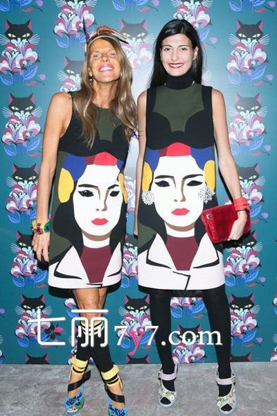 美国纽约,众星出席Miu Miu时尚派对。Anna Dello Russo和Giovanna Battaglia同穿Prada人像图案连衣裙和leggings凉鞋造型,十分可爱俏皮。