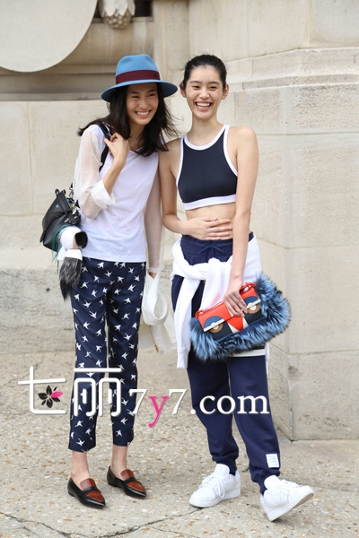 中国名模秦舒培和奚梦瑶这身春夏休闲风的姐妹造型简直就是休假最佳Look:Fendi皮草手袋和白色半透视上衣和黑色直筒裤,又或者阳光性感的运动造型:背心露脐装。