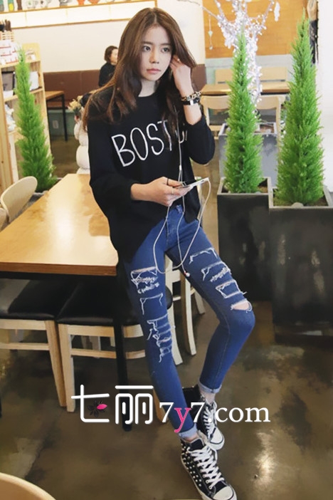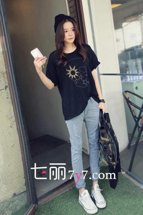 搭配五:黑色字母短袖T恤+破洞牛仔裤+帆布鞋
