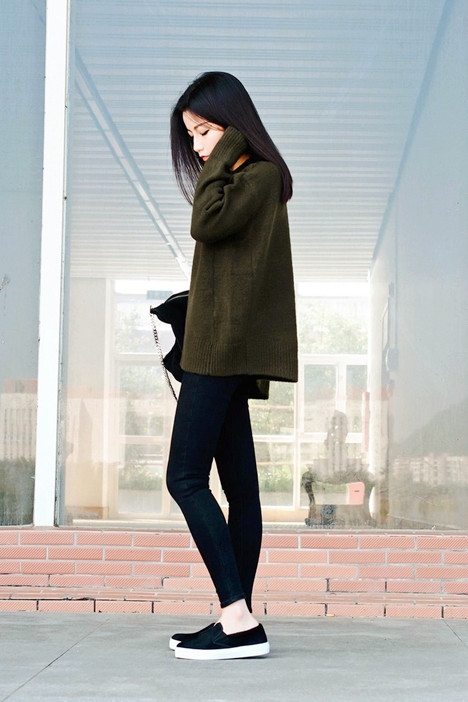 搭配看点:黑色紧身牛仔裤十分显瘦,上搭宽松的毛衣更显慵懒气质,鞋子选择同色乐福鞋,休闲又简约,同时还能延长腿部线条呢。