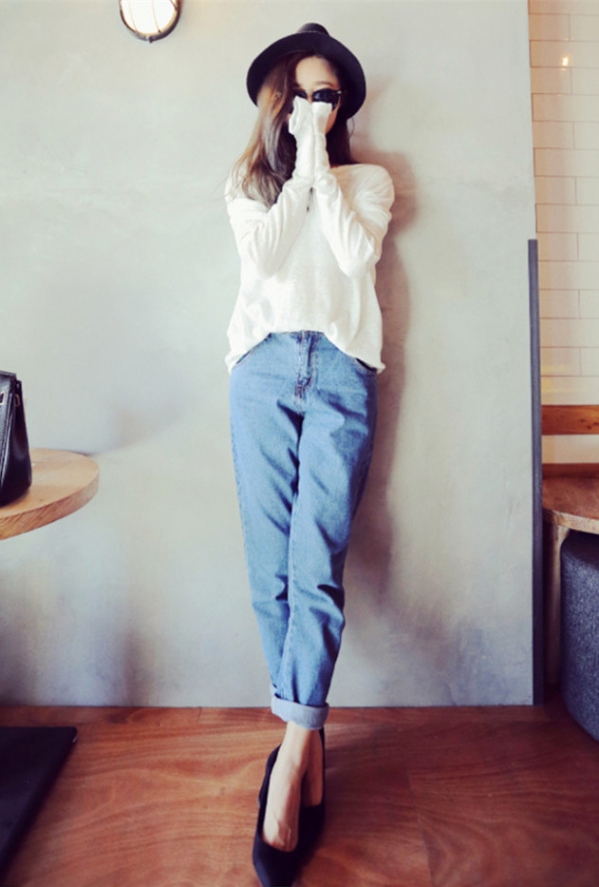 搭配八:牛仔裤+纯白上衣+尖头鞋