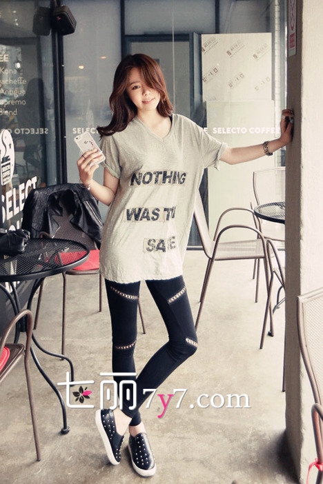 搭配看点:中长款V领灰色短袖T恤比较随意,同时也能遮住臀部的赘肉,适合臀部及大腿教胖的菇凉。搭配黑色牛仔裤和黑色乐福鞋十分的简约大方,裤装和鞋子统一的色彩也能够延长腿部线条,非常适合矮个子菇凉搭配选择哦。