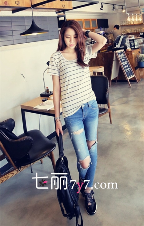 搭配十四:黑白条纹短袖T+破洞牛仔裤+运动鞋