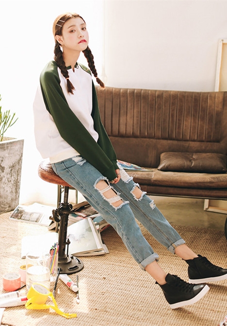 搭配看点:极简的拼色卫衣搭配破洞牛仔裤很有学院气息,装嫩首选~