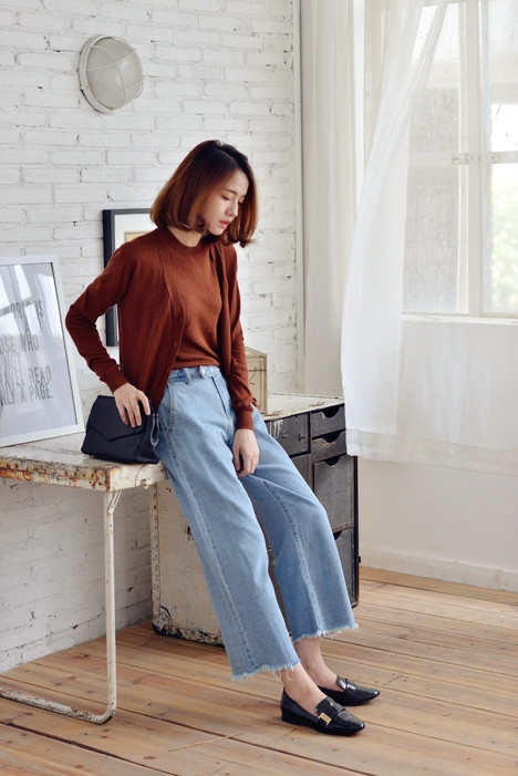 搭配十六:牛仔阔腿裤+焦糖色T+同色针织开衫