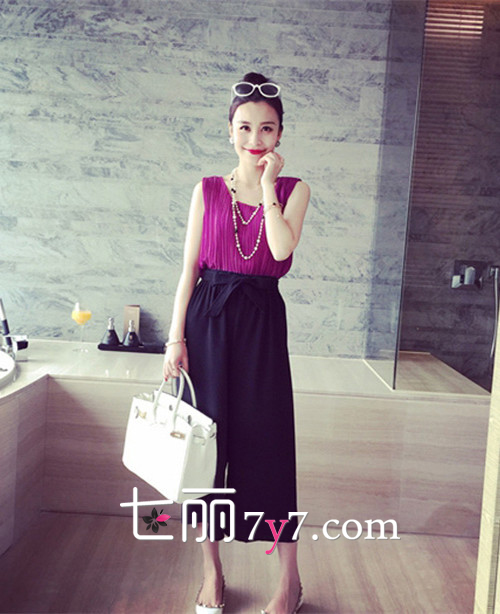 搭配看点:黑色七分阔腿裤搭配雪纺上衣十分清新亮眼哦,同样是宽松的设计,但却给人大方气质的感觉。雪纺上衣建议选择衣领教大的款式,同时不要有过多的设计。因为时下流行简约风,所以一件线条流畅的雪纺衫搭配潮流感十足的阔腿裤就是夏季穿衣的最佳选择了。鞋子选择尖头平底鞋,舒适又能拉长腿部线条哦。如果选择有色彩的雪纺上衣,那么其他的单品就最好选择无色彩黑白款,这样造型才能有焦点,不凌乱,穿出女王范哦。