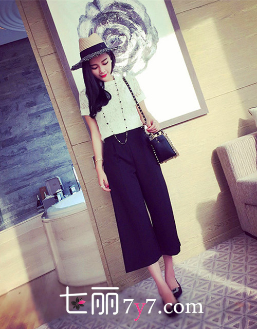 搭配示范四:黑色七分阔腿裤+蕾丝上衣+镶钻平底鞋
