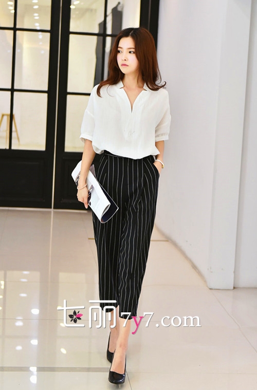 搭配看点:黑白竖条纹阔腿裤十分的舒适清爽,搭配一件气质的白衬衫才是整套造型的关键之处,尤其是衬衫的设计十分大气和简约,更显淡雅和干练。鞋子选择黑色浅口高跟鞋,最不会出错的百搭鞋款,当然,也可以选择踝间系带的款式,更贴合时下潮流。