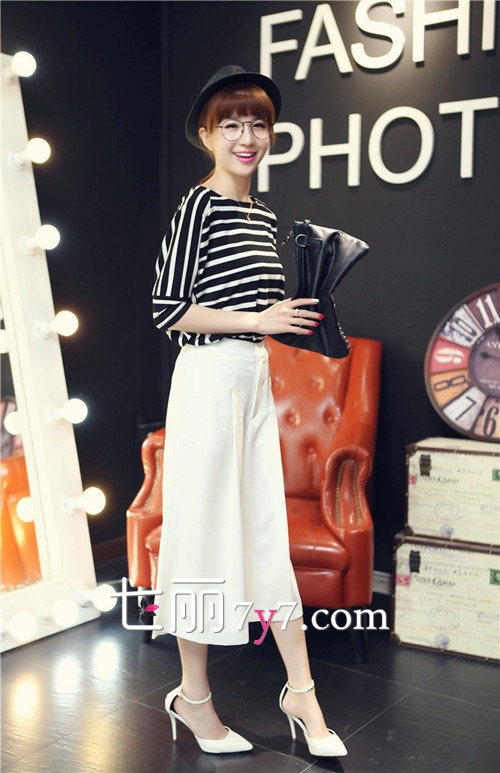 搭配六:七分阔腿裤+条纹T+白色高跟鞋