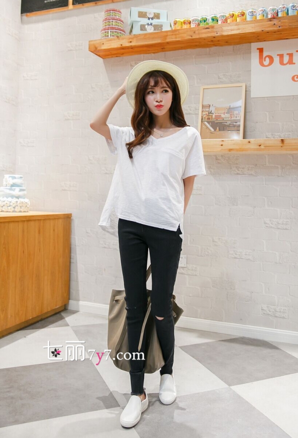 度假休闲风:白色T恤+破洞黑色牛仔裤+白色平底休闲鞋+浅色遮阳草帽