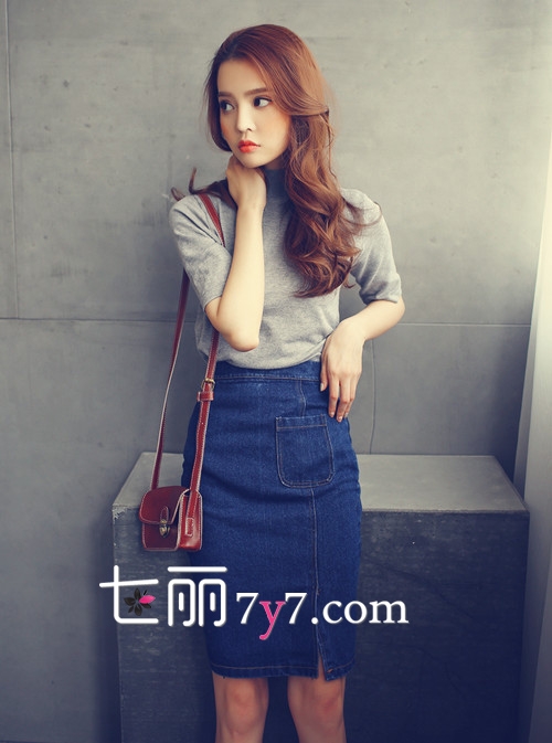 搭配看点:这套搭配非常具有复古气息。不过首先要说明哦,牛仔半身裙及膝的长度,不是很适合个子娇小的菇凉穿搭哦。因为及膝的长度很容易显腿短,如果小个子菇凉要购买牛仔半身裙的话,建议选择长及大腿中部的款式,露出更多腿部肌肤不仅性感,还显高哦。灰色中袖打底衫中低领的设计本身就极具复古气息,搭配一款牛仔高腰半身裙,更显柔美清新气质,一款棕色mini小包,呼应发色又十分可爱呢。