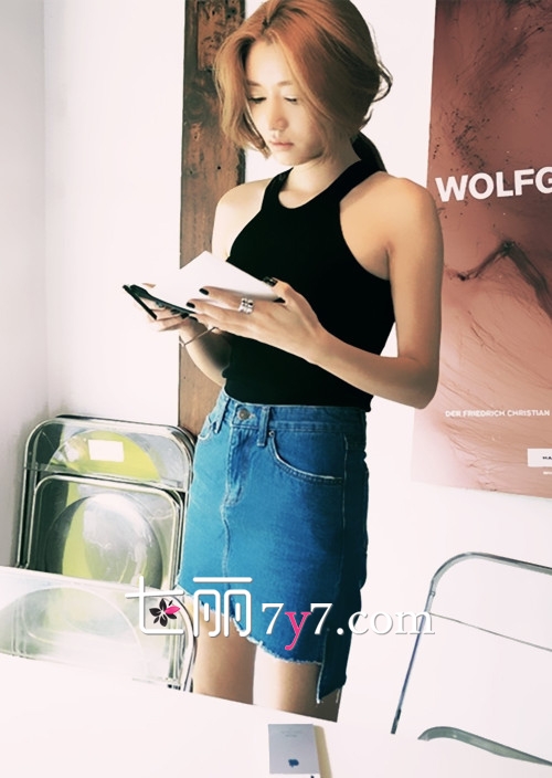 搭配二:牛仔半身裙+黑色吊带背心