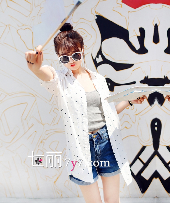 搭配看点:白底黑色小波点衬衫+灰色打底紧身短款背心+高腰牛仔短裤,这样一件百搭的休闲衬衫真是时尚MM的夏日必备呀,搭配一件灰色的紧身打底衫与高腰牛仔裤,甜美中带一点健康阳光的小性感呢。