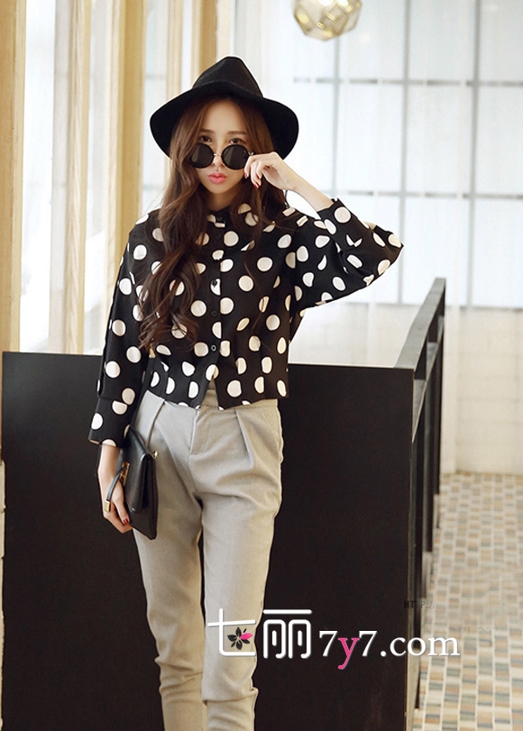 波点衬衫搭配图片,圆点衬衣女款搭配图片,波点衬衣全身搭配图片欣赏