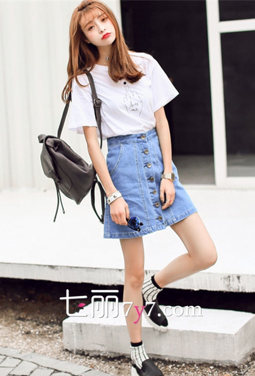 搭配看点:其实搭配好牛仔裙并不难,一件简约清爽的白T和一款黑色乐福鞋或其他平底鞋就OK,对于小个子菇凉来说,只要选择高腰的款式,并将上衣下摆塞进裙腰就十分精致和显高了,当然,还有一点就是,牛仔裙的长度最好在大腿中部,不仅性感还能露出更多腿部肌肤,视觉上更加拉长腿部线条。最后,如果,平底鞋还不能满足你,可以考虑搭配一双厚底凉拖或粗高跟凉鞋,保证分分钟增高哦。