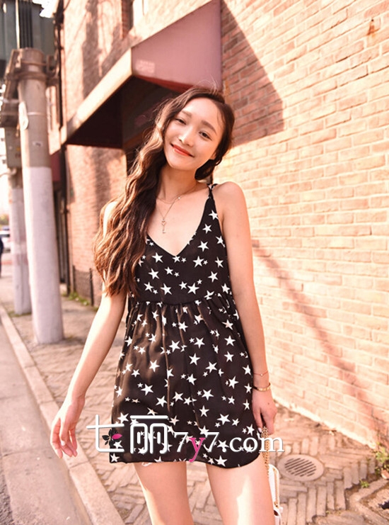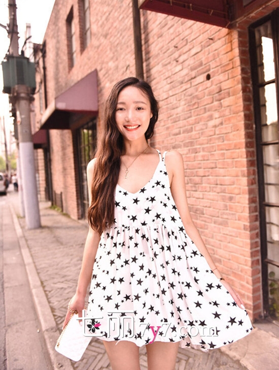 搭配看点:卡通图案连衣裙非常显嫩,比如星星图案或其他像樱桃、西瓜、香蕉等趣味十足又不乏时尚感的图案连衣裙。搭配帆布鞋或复古牛津,或者简单的一双人字拖,就十分美腻了哦。这样的搭配尤其适合小个子菇凉,同时选择腰部稍微宽松的款式更能修身身材,遮住小肚腩哦。