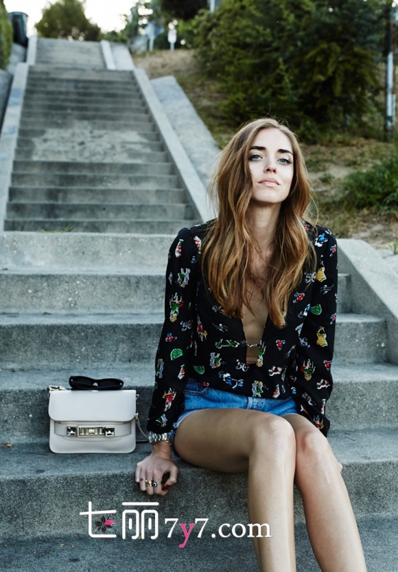 搭配看点:黑底碎花雪纺上衣+蓝色牛仔短裤。有别于意大利女人的冷艳、性感,长相甜美的Chiara更偏爱轻柔、甜美的碎花雪纺,却又喜欢用牛仔等气质硬朗的单品来做搭配,略带酷感的甜美风格Style是她的拿手好戏。这样“软硬兼施”混搭style能够为我们带来无尽的创意灵感!