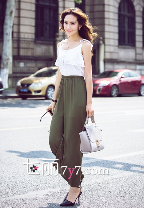 搭配一:雪纺阔腿裤+白色吊带上衣