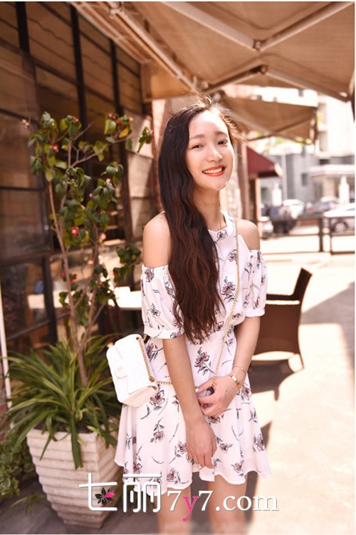 搭配看点:露肩碎花连衣裙十分的性感,而白色系碎花连衣裙更加适合夏日穿搭,抢眼又清爽,搭配一款白色mini链条包更显精致。