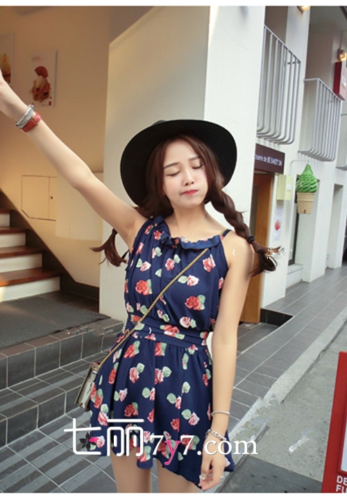 搭配看点:藏蓝色碎花连衣裙比较显瘦哦,相对于黑色碎花连衣裙更加显嫩和个性,搭配一顶宽檐帽和mini斜挎包就十分出众了,很适合学生MM出街或出游穿搭哦。